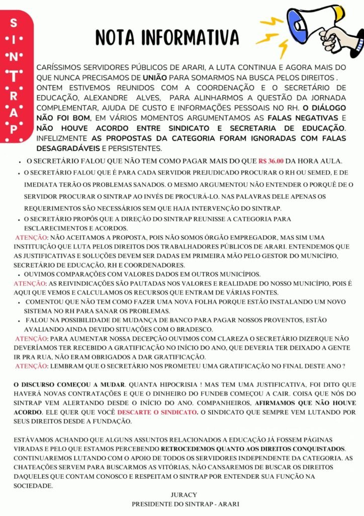 ATENÇÃO: NÃO ACEITAMOS A PROPOSTA, POIS NÃO SOMOS ÓRGÃO EMPREGADOR, MAS SIM UMA INSTITUIÇÃO QUE LUTA PELOS DIREITOS DOS TRABALHADORES PÚBLICOS DE ARARI, ENTENDEMOS QUE AS JUSTIFICATIVAS E SOLUÇÕES DEVEM SER DADAS EM PRIMEIRA MÃO PELO GESTOR DO MUNICIPIO, SECRETÁRIO DE EDUCAÇÃO, RH E COORDENADORES.