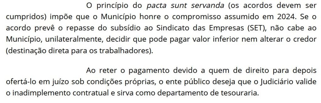 “O princípio do pacta sunt servanda impõe que o Município honre o compromisso assumido. Se o acordo prevê o repasse do subsídio ao SET, não cabe ao Município decidir, por conta própria, pagar valor inferior ou alterar o credor”, afirmou.