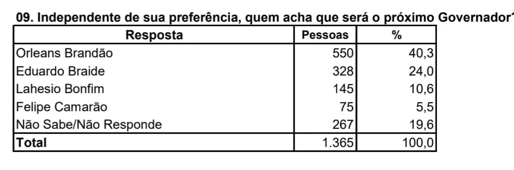 Sobre a expectativa de vitória, o maior percentual também é o emedebista. Dos entrevistados, 40,3% disseram que acreditam que Orleans será o próximo governador do Maranhão. Já para 24%, quem comandará o estado será Braide. Outros 10,6%, afirmaram que será Lahesio o eleito e 5,5% opinaram dizendo que o governador será Felipe Camarão.