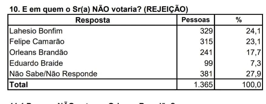 Quanto a rejeição, a maior é do ex-prefeito de São Pedro dos Crentes. Ds ouvidos, 24,1% afirmaram que não votam em Lahesio. Em Camarão, 23,1% garantiram que não votam. Dos que não votam em Orleans somam 17,7%. A menor rejeição é do prefeito de São Luís: 7,3%.