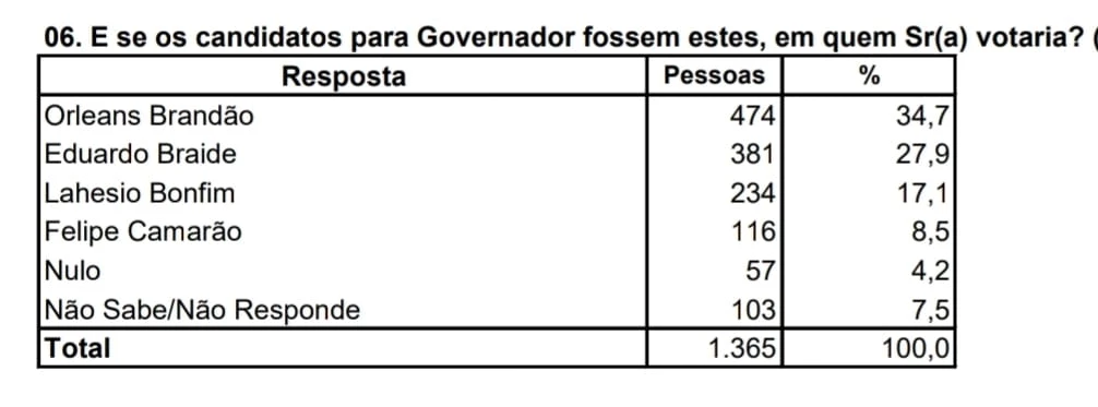 No primeiro cenário estimulado, Orleans Brandão aparece com 34,7% das intenções de voto. Ele é seguido por Eduardo Braide (PSD), prefeito de São Luís, que tem 27,9%. Lahesio Bonfim (Novo), ex-prefeito de São Pedro dos Crentes, tem 17,1% e o vice-governador, Felipe Camarão (PT), 8,5%.