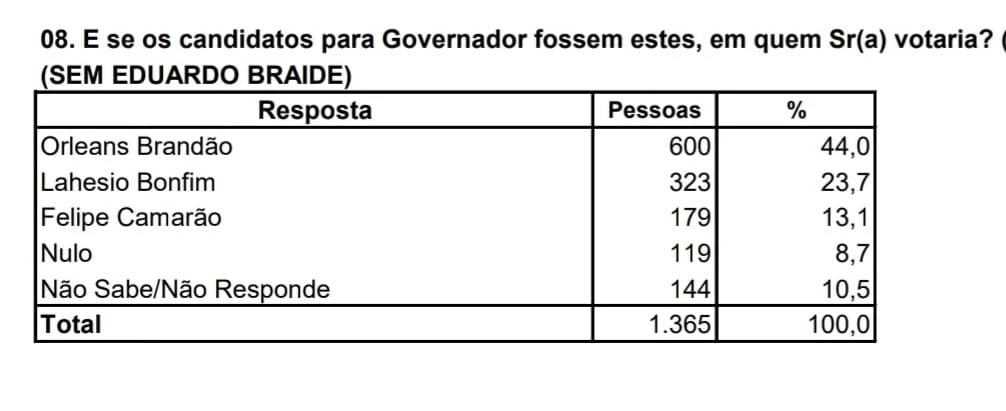 Já no cenário sem o prefeito de São Luís, os números são: Orleans Brandão (44%), Lahesio Bonfim (23,7%) e Felipe Camarão (13,1%). Não Sabem ou não responderam somaram 10,5% e nulo, 8,7%.