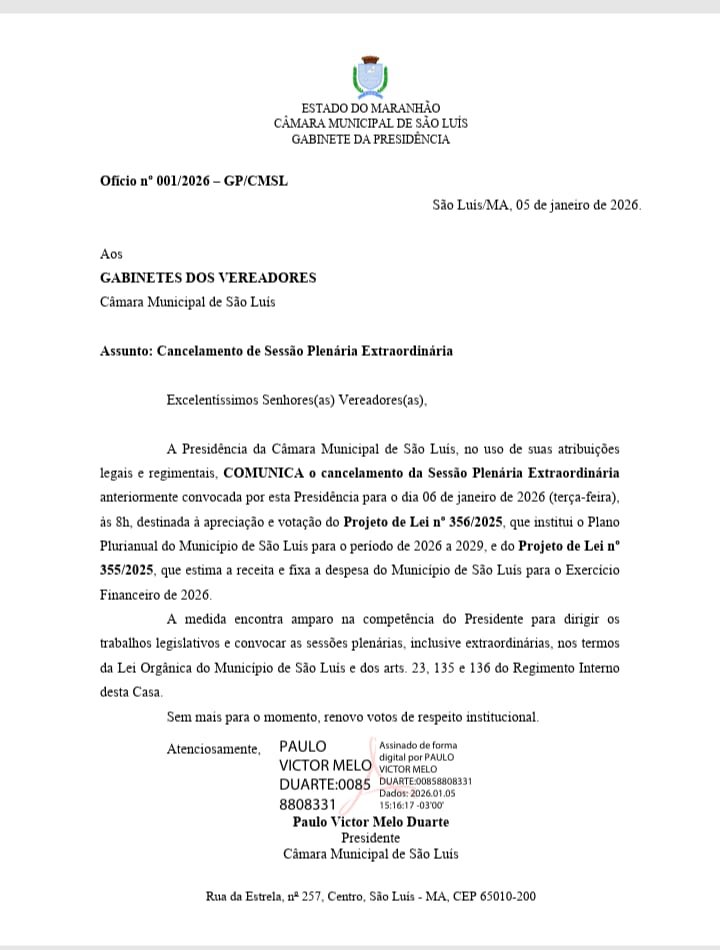 O presidente da Câmara Municipal de São Luís, vereador Paulo Victor (PSB) por meio de ofício anunciou aos demais vereadores da capital ontem segunda-feira (5) o cancelamento da sessão extraordinária que ocorreria nesta terça-feira (6) para votar a Lei Orçamentária Anual 2026 da cidade.