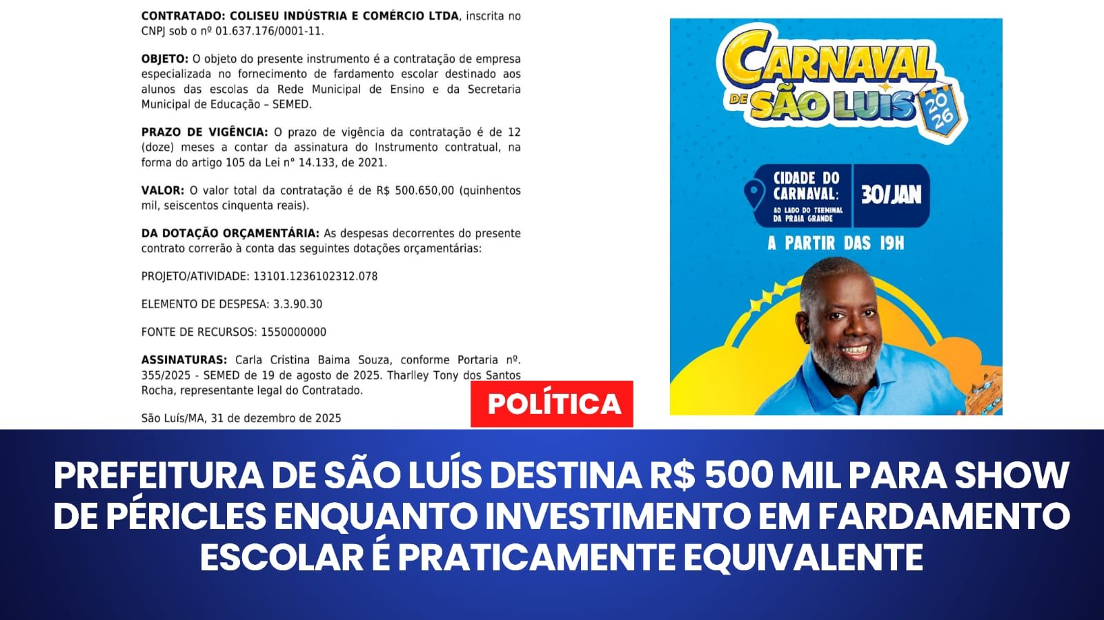 Enquanto milhares de estudantes da rede municipal de São Luís aguardam melhorias estruturais na educação, a Prefeitura destinou R$ 500 mil para a contratação do cantor Péricles, que se apresentará no Carnaval de São Luís 2026, conforme publicação no Diário Oficial do Município do dia 6 de janeiro de 2026.A contratação foi realizada pela Secretaria Municipal de Cultura (Secult), por meio de inexigibilidade de licitação, com base no artigo 74, inciso II, da Lei Federal nº 14.133/2021.