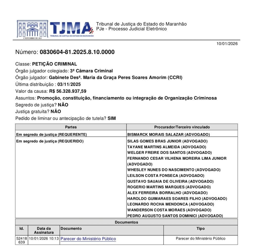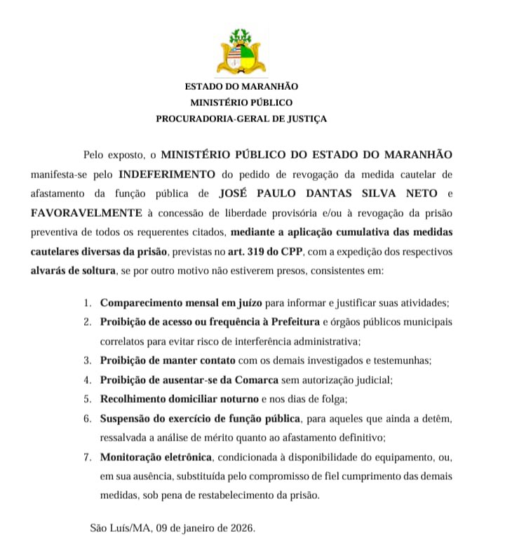 “Pelo exposto, o MINISTÉRIO PÚBLICO DO ESTADO DO MARANHÃO manifesta-se pelo INDEFERIMENTO do pedido de revogação da medida cautelar de afastamento da função pública de JOSÉ PAULO DANTAS SILVA NETO e FAVORAVELMENTE à concessão de liberdade provisória e/ou à revogação da prisão preventiva de todos os requerentes citados, mediante a aplicação cumulativa das medidas