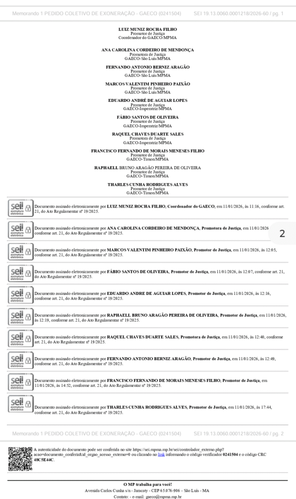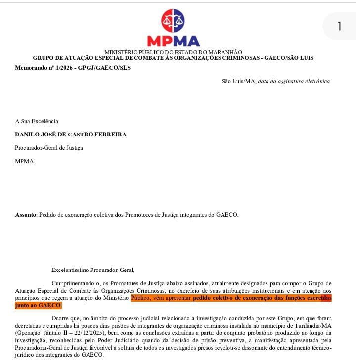 Neste domingo (11), os 10 (dez ) promotores que integram o Grupo de Atuação Especial de Combate às Organizações Criminosas do Ministério Público do Maranhão (GAECO/MPMA) encaminharam ao Procurador-Geral de Justiça, Danilo José de Castro Ferreira, o “Memorando nº 1/2026 – GPGJ/GAECO/SLS”, solicitando exoneração coletiva dos cargos que ocupam no órgão.