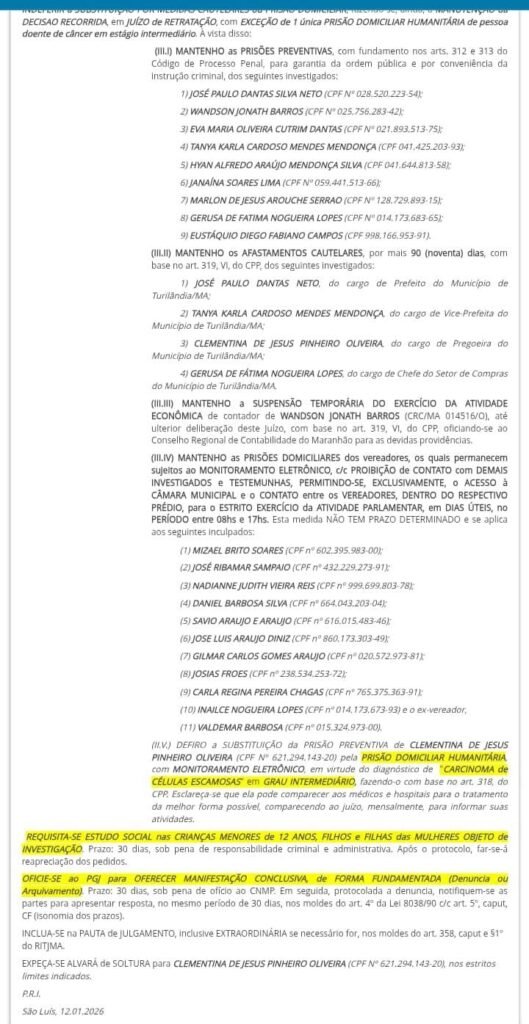 Entre os investigados que permanecem presos estão o prefeito afastado de Turilândia, Paulo Curió, a primeira-dama Eva Curió, além de secretários, operadores financeiros e empresários apontados como integrantes do núcleo central do esquema.