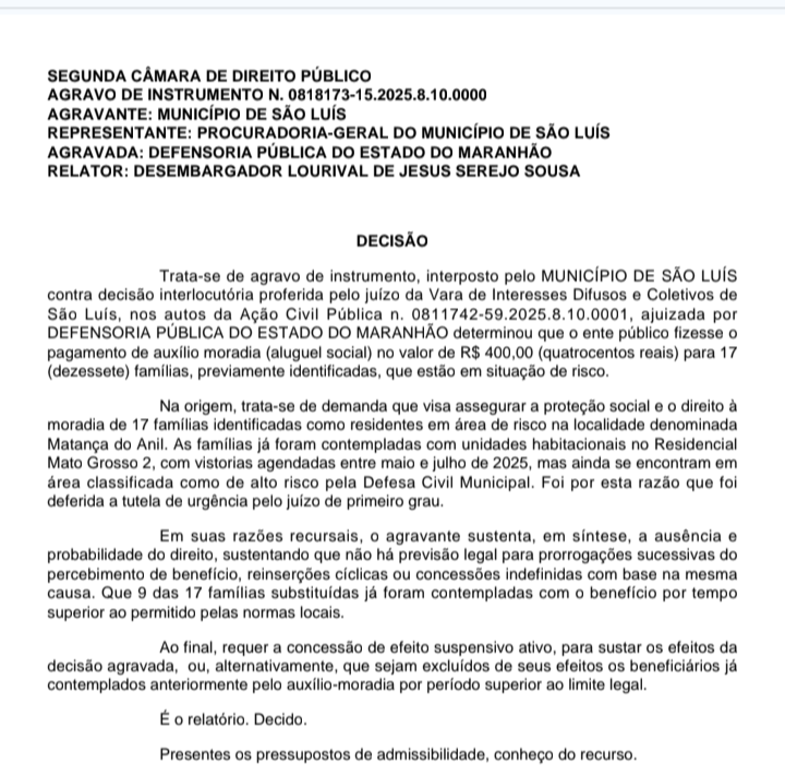 A determinação, do juiz Douglas de Melo Martins, resultou do julgamento da Ação Civil Pública ajuizada pela Defensoria Pública do Maranhão contra o Município de São Luís, para garantir o direito à moradia digna às famílias que vivem em área de risco social.