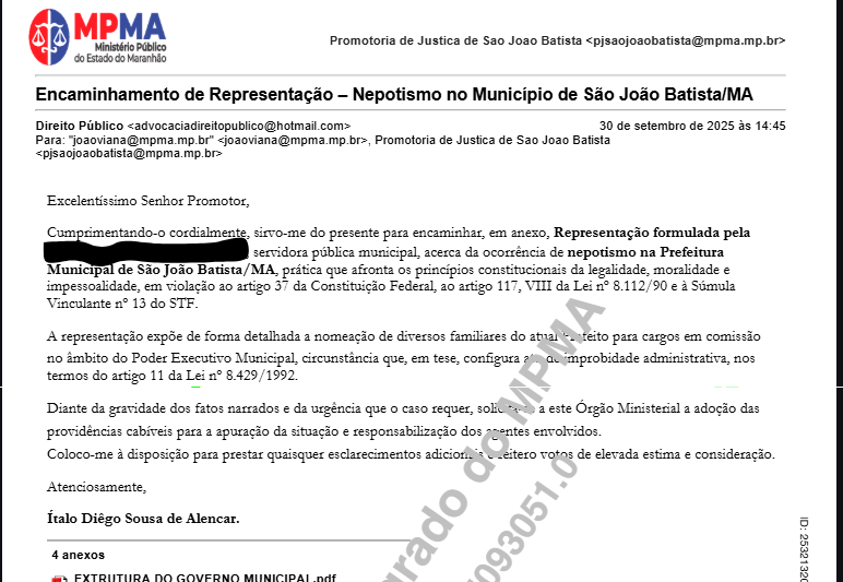 O Ministério Público do Estado do Maranhão (MPMA), por meio da Promotoria de Justiça de São João Batista, instaurou procedimento investigatório para apurar denúncia de nepotismo contra o prefeito Emerson Lívio Soares Pinto, conhecido como Mecinho. A representação foi protocolada em 30 de setembro de 2025 pelo advogado Ítalo Diêgo Sousa de Alencar, em nome da servidora pública municipal de São João Batista.