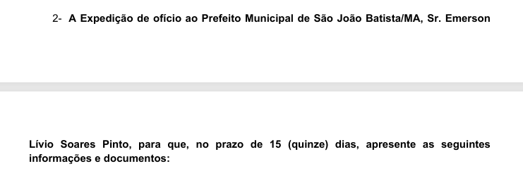 O Ministério Público determinou que o prefeito Emerson Lívio Soares Pinto apresente, no prazo de 15 dias, cópia dos atos de nomeação (decretos ou portarias) dos servidores listados na representação. O objetivo é verificar a legalidade das nomeações e confirmar se houve prática de nepotismo no âmbito do Poder Executivo Municipal.