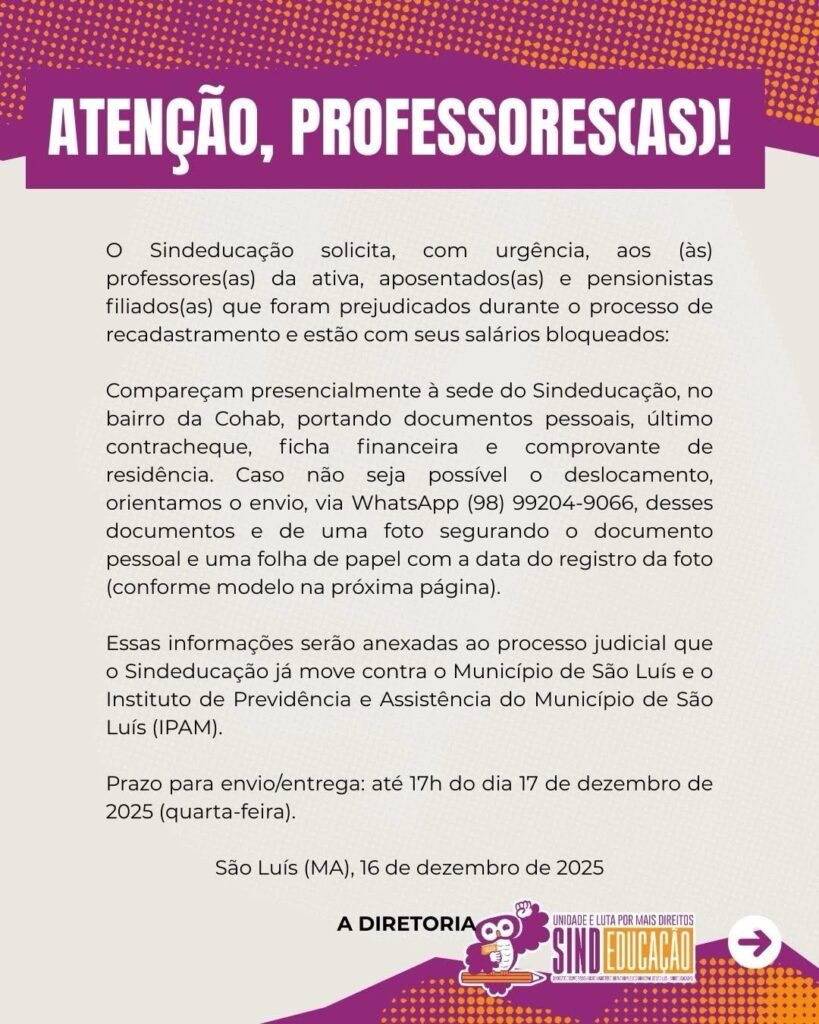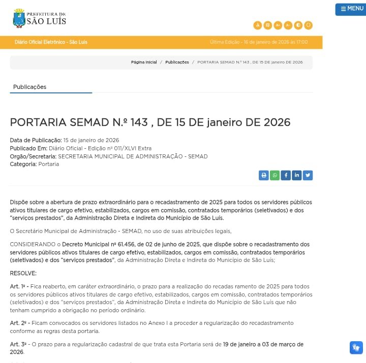São Luís (MA) — Após intensa mobilização de sindicatos, professores e servidores públicos — ativos e aposentados — a Prefeitura de São Luís anunciou a reabertura extraordinária do prazo para o recadastramento funcional referente ao Censo 2025. A medida foi oficializada por meio da Portaria SEMAD nº 143, publicada no Diário Oficial Eletrônico em 15 de janeiro de 2026.