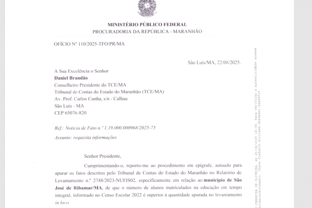 Diante das irregularidades, o Ministério Público Federal (MPF), por meio da Procuradoria da República no Maranhão, enviou o Ofício nº 110/2025-TFO/PR/MA ao presidente do TCE/MA, Daniel Brandão, requisitando esclarecimentos sobre a divergência entre os dados do Censo Escolar de 2022 e os números reais apurados em inspeções presenciais.