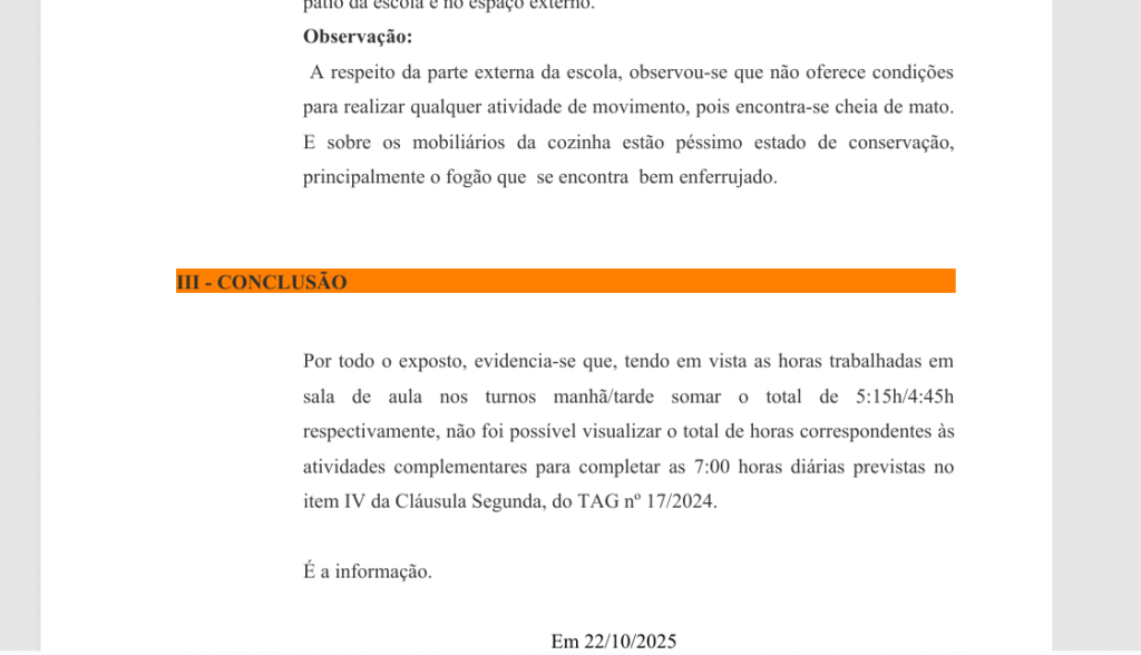 “Não foi possível visualizar o total de horas correspondentes às atividades complementares para completar as 7:00 horas diárias previstas”, afirma a auditora no documento oficial datado de 22 de outubro de 2025.