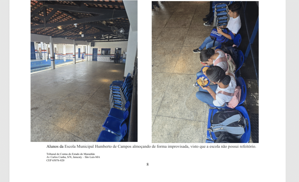 A Unidade Dr. Paulo Ramos, localizada na zona urbana, não possui pátio, sala de informática, robótica ou espaço para práticas esportivas. A sala de recursos para alunos com deficiência é descrita como “mínima”. Já a Escola Municipal Acto Juvêncio Nogueira, no povoado Tijupá Queimado, realiza atividades em áreas externas tomadas por mato, sem condições adequadas de segurança. O fogão da cozinha está enferrujado e os móveis em péssimo estado.