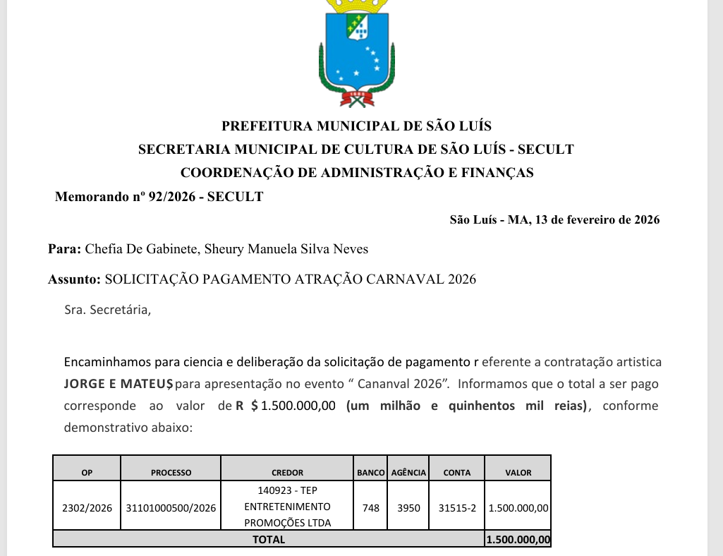 Na noite da última sexta-feira, 13 de fevereiro de 2026, a Prefeitura de São Luís desembolsou R$ 1.500.000,00 para bancar o pagamento de aproximadamente uma hora e meia de uma das atrações da dupla sertaneja Jorge e Mateus.