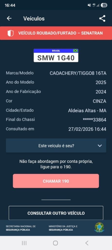 O alerta oficial do Ministério da Justiça orienta que qualquer pessoa que visualize o carro não deve realizar abordagem por conta própria, devendo acionar imediatamente a Polícia Militar via 190.