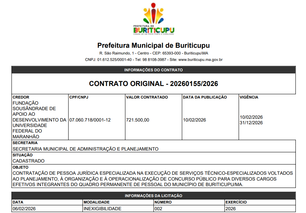 A Prefeitura de Buriticupu deu um passo concreto para regularizar seu quadro de pessoal após anos de impasses jurídicos. Pressionada por uma recente decisão judicial, a gestão municipal firmou contrato com a Fundação Sousândrade para a organização e realização do aguardado concurso público.