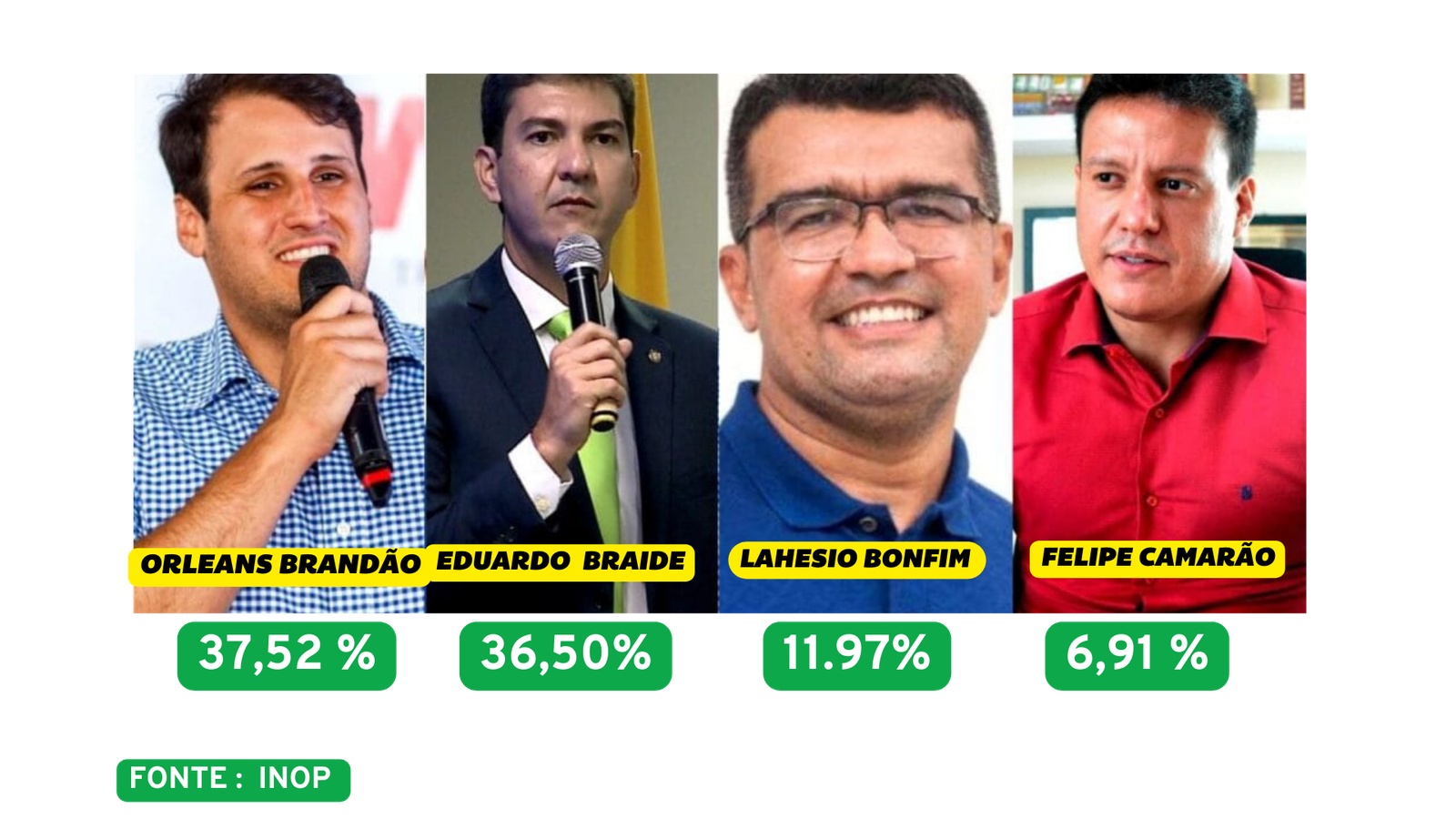 Depois do Instituto Paraná Pesquisas, foi a vez do INOP divulgar números e confirmar um cenário equilibrado na disputa. De acordo com a pesquisa, Orleans Brandão (MDB) aparece com 37,52%, contra 36,50% de Eduardo Braide (PSD) , A pesquisa mostrou também que Lahésio Bonfim (PSC) surge em terceiro lugar com 11,97%, seguido por Felipe Camarão (PT), com 6,91%. Já 1,92% dos entrevistados afirmaram não votar em nenhum dos nomes apresentados, enquanto 5,18% disseram não saber ou preferiram não opinar.
