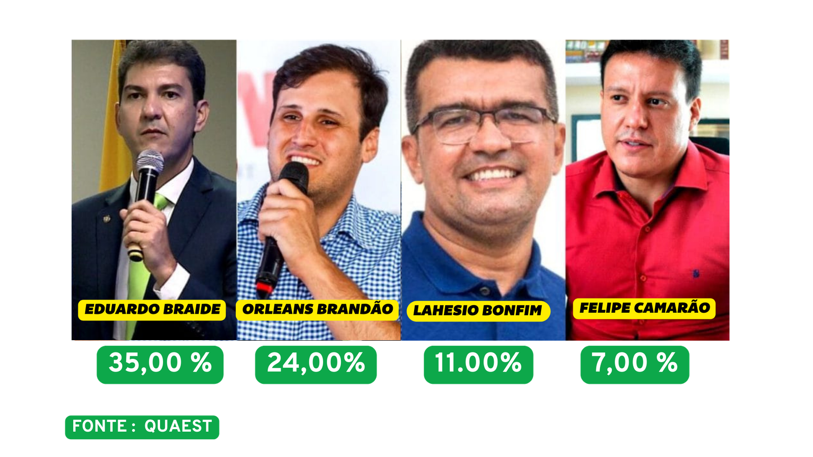 Os cenários estimulados mostram vantagem do prefeito da capital. No primeiro, Braide aparece com 35%, Orleans com 24%, Lahesio Bonfim com 11% e Camarão com 7%. Mas se a disputa não tiver Felipe Camarão, os números são esses: Eduardo Braide com 37%, Orleans Brandão com 26% e Lahesio Bonfim com 13%.