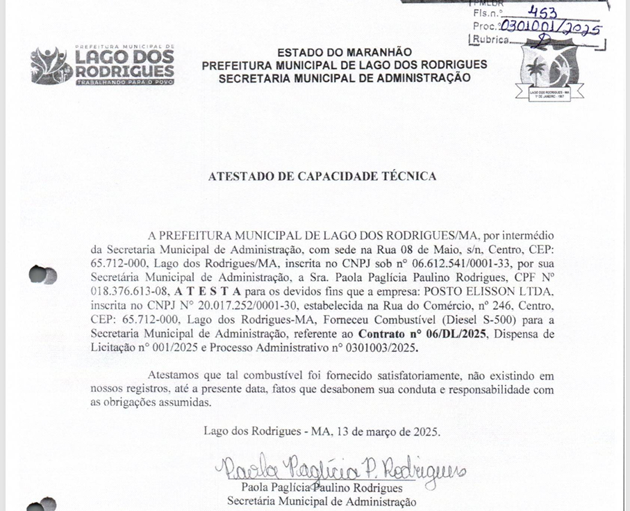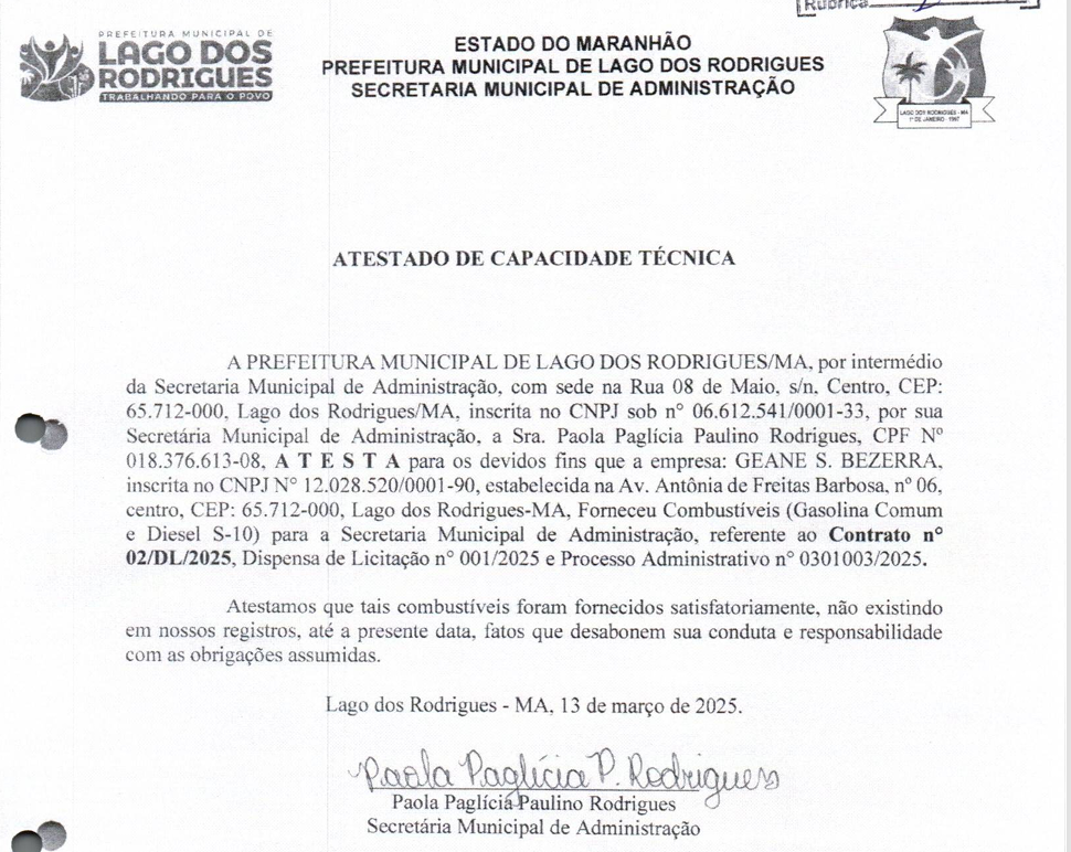 A representação também questiona a habilitação das empresas contratadas — GEANE S BEZERRA e POSTO ELISSON LTDA – ME. Conforme o documento, ambas teriam apresentado atestados de capacidade técnica fornecidos pela própria contratante